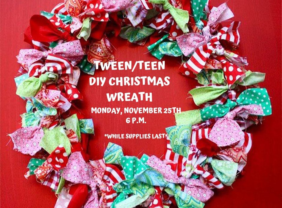 Come make your own Christmas wreath out of fabric pieces! Perfect for your bedroom wall or door! WHILE SUPPLIES LAST. For more information, please call 365-3396 ext 11.