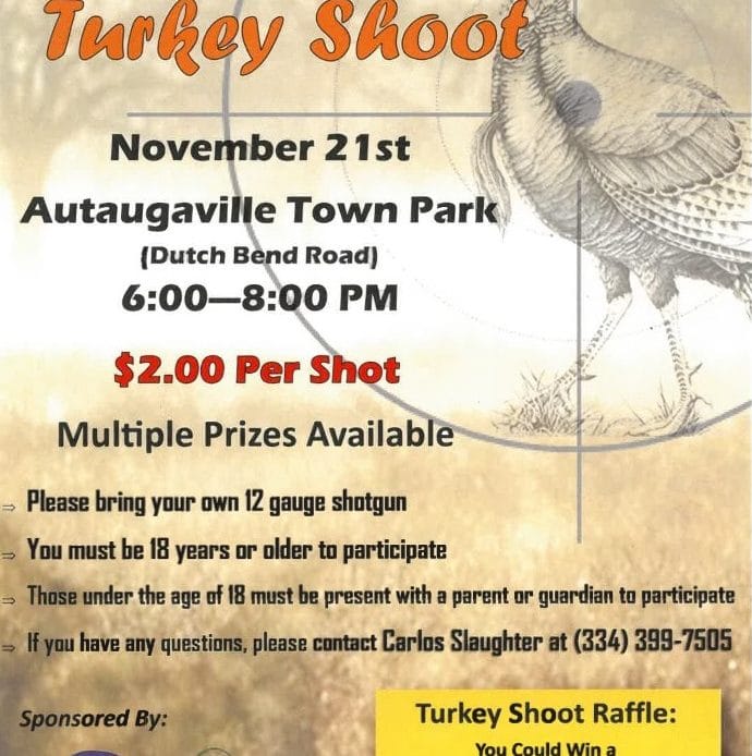 The 2019 Turkey Shoot will be held Nov. 21 at Autaugaville Town Park (Dutch Bend Road) from 6-8 p.m. It is $2 per shot with multiple prizes available. Please bring your own 12-guage shotgun; you must be 18 years of age or older to participate; those under the age of 18 must be present with a parent or guardian to participate; If you have questions, please contact Carlos Slaughter at (334) 399-7505. You could win a Remington 12-Guage 870 Shotgun, a $399 value. Raffle tickets on sale now for $7 each. Sponsored by Eleven86 Water.