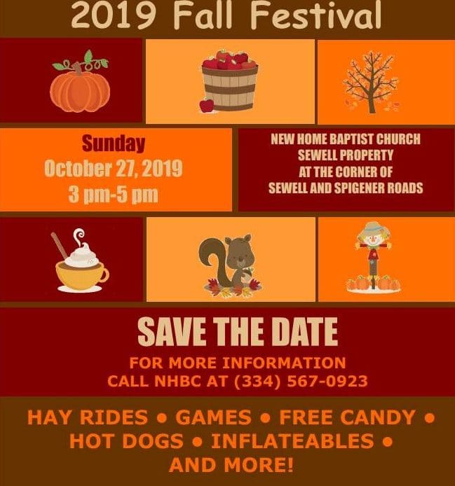 New Home Baptist Church will host its 2019 Fall Festival Sunday, Oct. 27 from 3-5 p.m. There will be hay rides, games, free candy, hot dogs, inflatables and much more. Free admission. It will be at the New Home Baptist Church Sewell Property at the corner of Sewell and Spigener Roads.