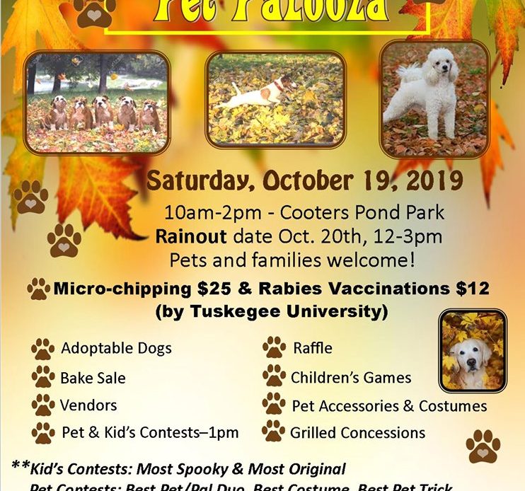PAHS will be having its seventh annual Pet Palooza on Saturday, Oct. 19th, from 10:00 am until 2:00 pm at Cooters Pond Park. We will have a raffle, adoptable pets, costume/pet contests, children’s games, bake sale, vendors, lots of pet accessories, and much more. Speaking of dog accessories–we will have dog clothes including costumes, coats, Christmas apparel, leashes, collars, etc. available for just a monetary donation to PAHS. Micro-chipping by Tuskegee University will be available for just $25; and rabies vaccinations will be offered for only $12! Pet and child costume contests are a favorite among those who attend Pet Palooza! It’s so much fun to see everyone dressed up! The winner of each category will receive a great prize! Contests will begin at 1 pm this year and the categories are: Children’s Contests: Most Spooky, Most Original. Pet Contests: Best Pet/Pal Duo (child and pet together), Best Costume and Best Pet Trick. Rain out date is Sunday, Oct. 20th, from 12:00 pm until 3:00 pm.