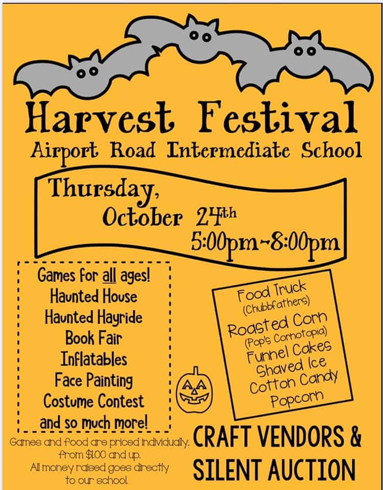 Airport Road Intermediate School in Millbrook will host their HUGE Fall Festival at the school from 5-8 p.m. Games for all ages! haunted house, haunted hayride, book air, inflatables, face painting, costume contest and much more. Chubbfathers Food truck will be on site. Roasted corn (Pop’s Cornotopia), funnel cakes, shaved ice, cotton candy, popcorn. Games and food are priced individually from $1 and up. Craft Vendors and Silent Auction.