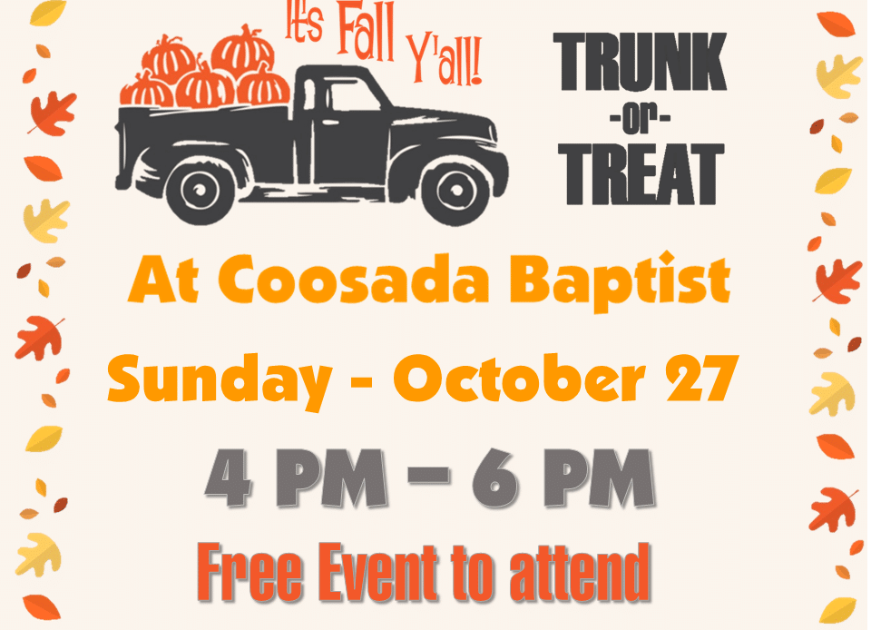 The Coosada Baptist Church will celebrate Fall at a special event from 4-6 pm on Sunday, October 27 at the church. The event is free to attend an enjoy popcorn, cotton candy, snow-cones, lots of games, and don’t forget the candy. There will be a hotdog concession stand if the families would like to purchase a small meal that will go towards missions.