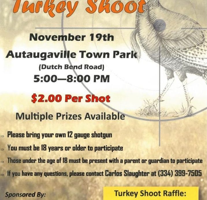 The 2019 Turkey Shoot will be held Nov. 19 at Autaugaville Town Park (Dutch Bend Road) from 6-8 p.m. It is $2 per shot with multiple prizes available. Please bring your own 12-guage shotgun; you must be 18 years of age or older to participate; those under the age of 18 must be present with a parent or guardian to participate; If you have questions, please contact Carlos Slaughter at (334) 399-7505. You could win a Remington 12-Guage 870 Shotgun, a $399 value. Raffle tickets on sale now for $7 each. Sponsored by Eleven86 Water.