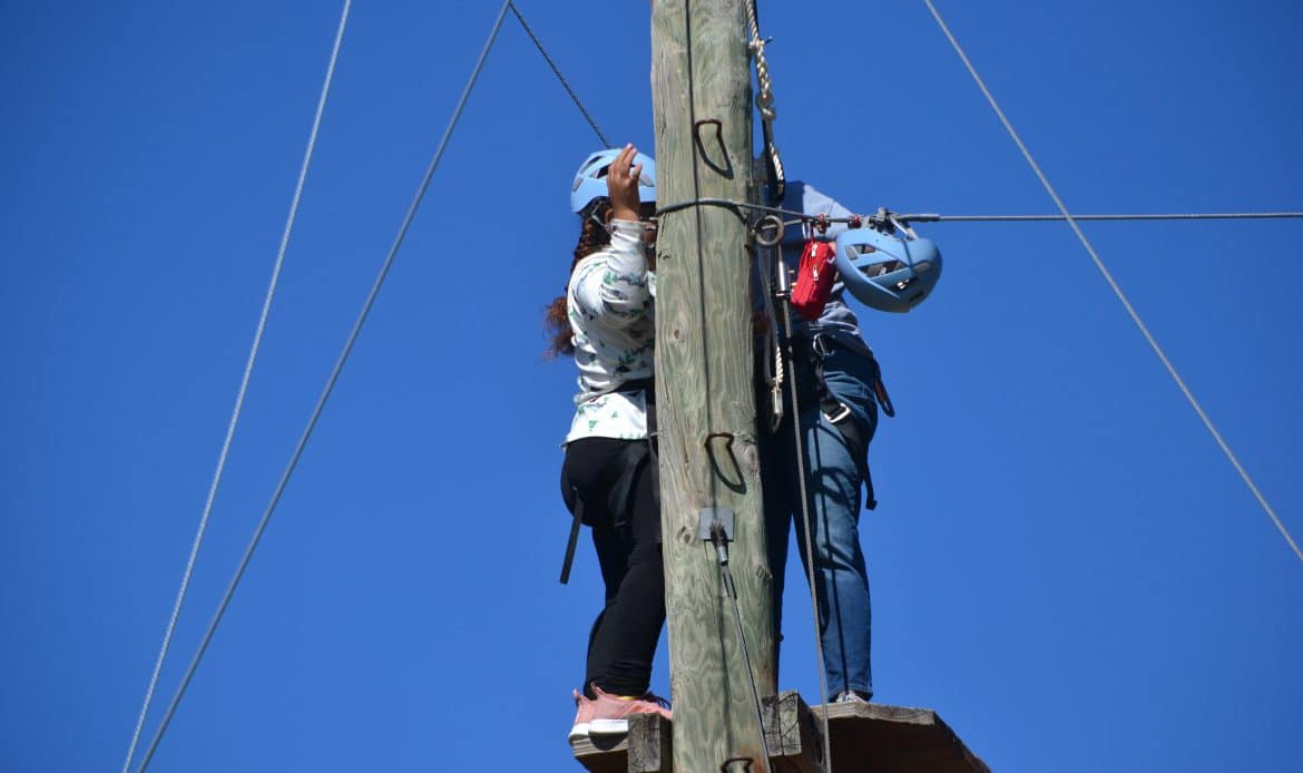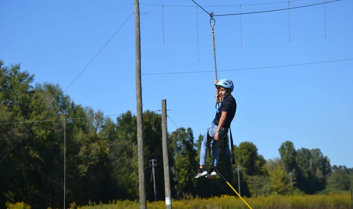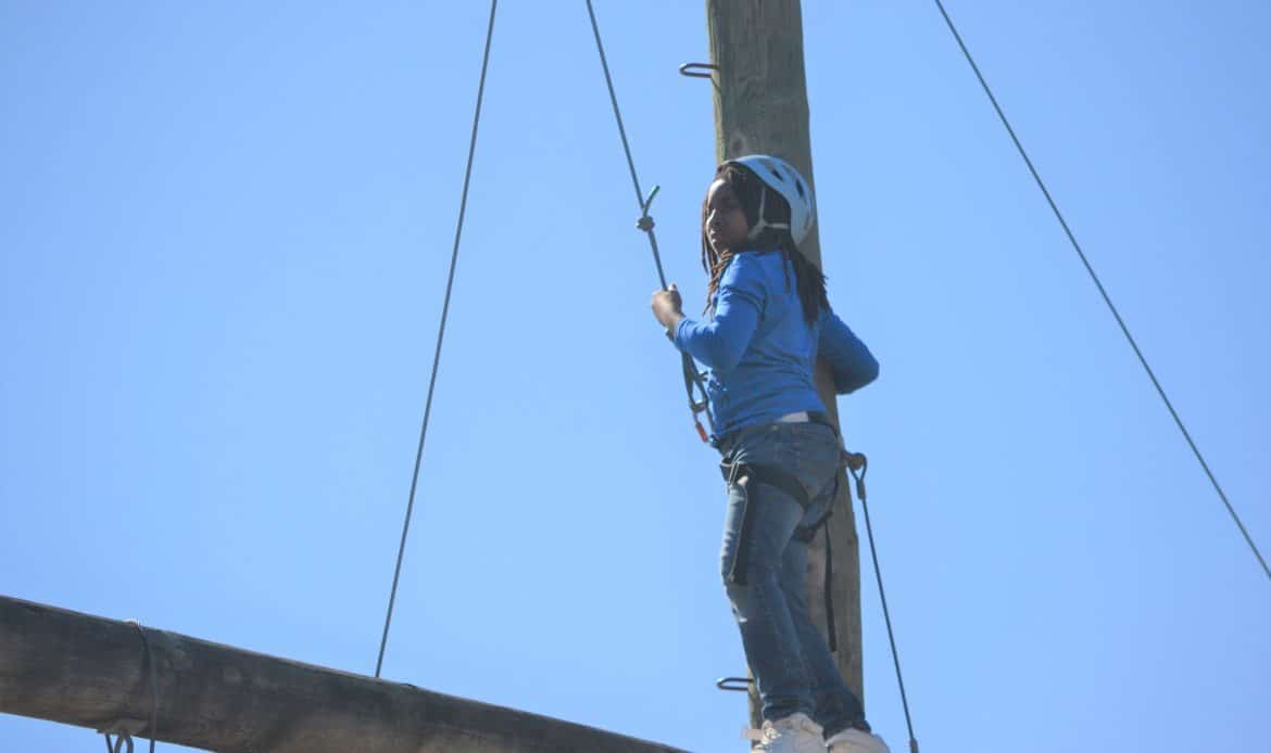 Over 40 feet in the air, a large, horizontal wooden pole supported by two beams towers over the grounds. The middle schoolers climb up one of the poles and make the journey from one side to the other – some quicker than others.