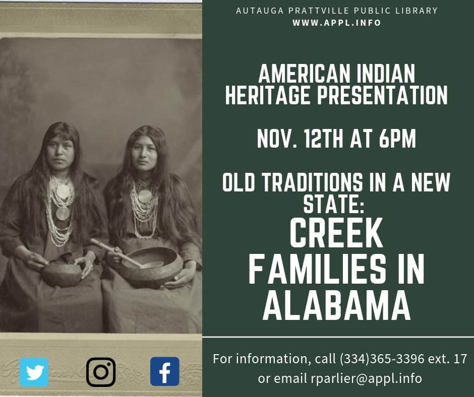 Autauga Prattville Public Library to Present ‘Old Traditions in a New State: Creek Families of Alabama’ Nov. 12