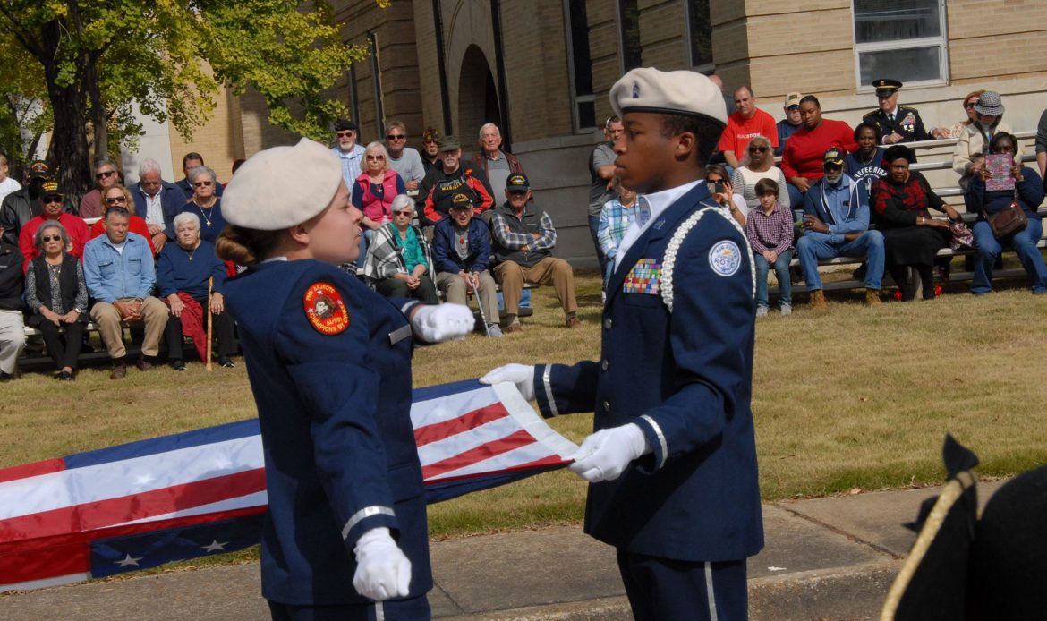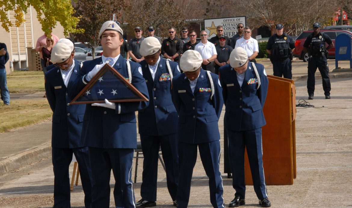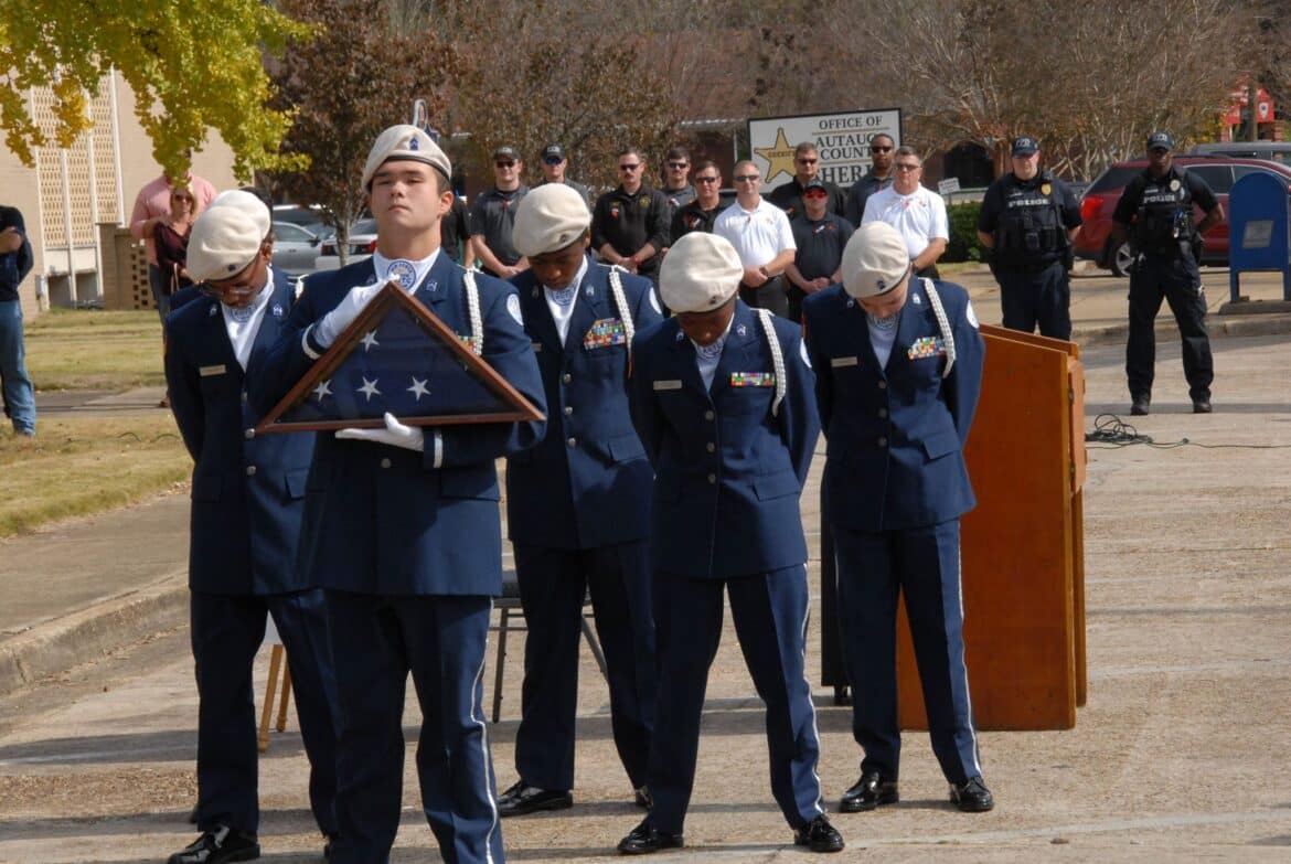 Following his speech, the Prattville High School JROTC moved in unison to the front of the audience for the folding of the flag. After the flag was folded 12 times and safely secured, the crowd gave out a large roar and stood in applause – and would continue to stand as Mayor Gillespie, JD Jones, Christine Shavers and Melinda King presented the wreath. This was met with moment of silence, encouraging the audience to reflect on such an important day.