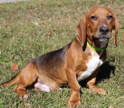 David is an 1-year-old male Basset Hound mix who must be neutered before he is adopted.  He was found out in the county as a stray and his owner never came to reclaim him.  David is adorable!  His body is mostly brown; he has white markings; and he has black highlights spread over his brown coat!  This guy is so handsome; and of course he has those cute, short, little Basset Hound legs.  David weighs 30 pounds so he is a wonderful size to fit in just about anywhere!  He is a popular guy who gets along well with children and other dogs.  David is friendly, sweet, and just too precious for words!  Come out and meet David ASAP if you want him to be your new best friend!