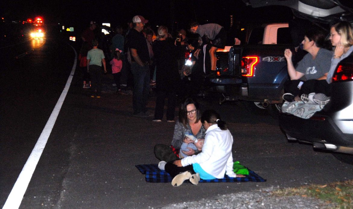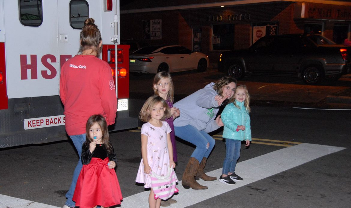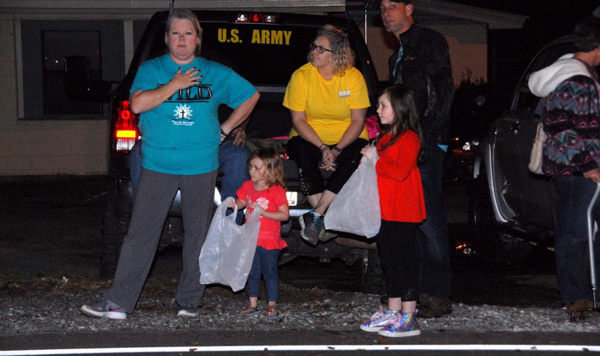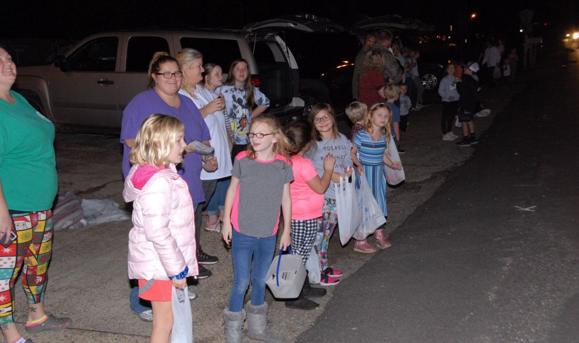 Along the parade route, families sat on tailgates, on blankets or stood in groups to wave as floats passed by, and candy flew through the night air.