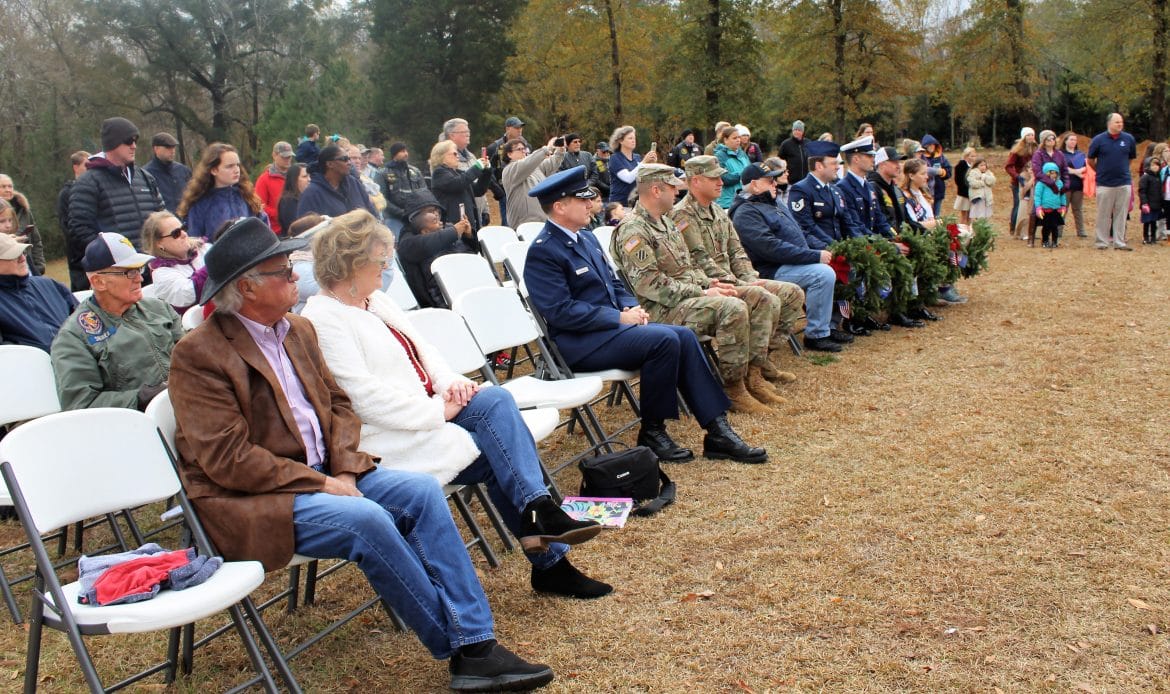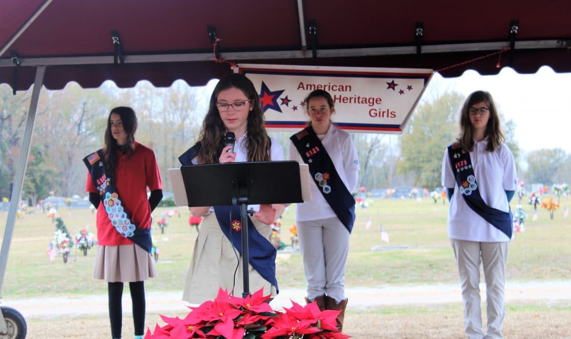 The Wreath Laying Ceremony was part of National Wreaths Across America Day. The ceremony is held simultaneously across the country at more than 1,600 participating locations. The goal is to place a live, balsam fir veteran’s wreath at the headstone of every veteran buried there, spread patriotism and ensure no one is forgotten, said Susan Waldrop, troop coordinator.