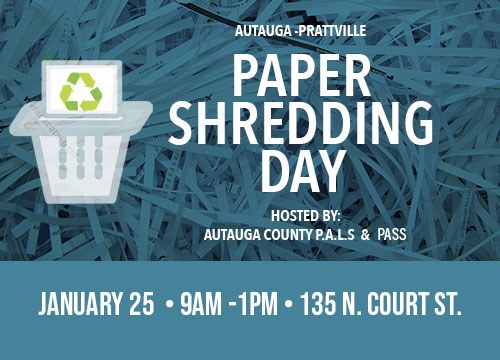 Autauga County P.A.L.S. & PASS (Teen Court), in partnership with International Paper, and Recycle Service Corp (RSC) of Montgomery, will host another Paper Shredding Event on JAN 25, 2020 @ Autauga County Commission, 135 N Court St., from 9 am – 1 pm. (NOT FOR BUSINESS). SHRED personal documents (tax returns, health records, financial data) for free, secure, safe disposal & recycling. LIMIT=5 BOXES. DROP-OFF between Chamber (W 4th St.) & DHR (W 5th St.) on N Court St., from 9 am to 1 pm. Volunteers will unload. Other counties welcome. Divert waste from landfill; free up storage space; and create jobs by recycling.