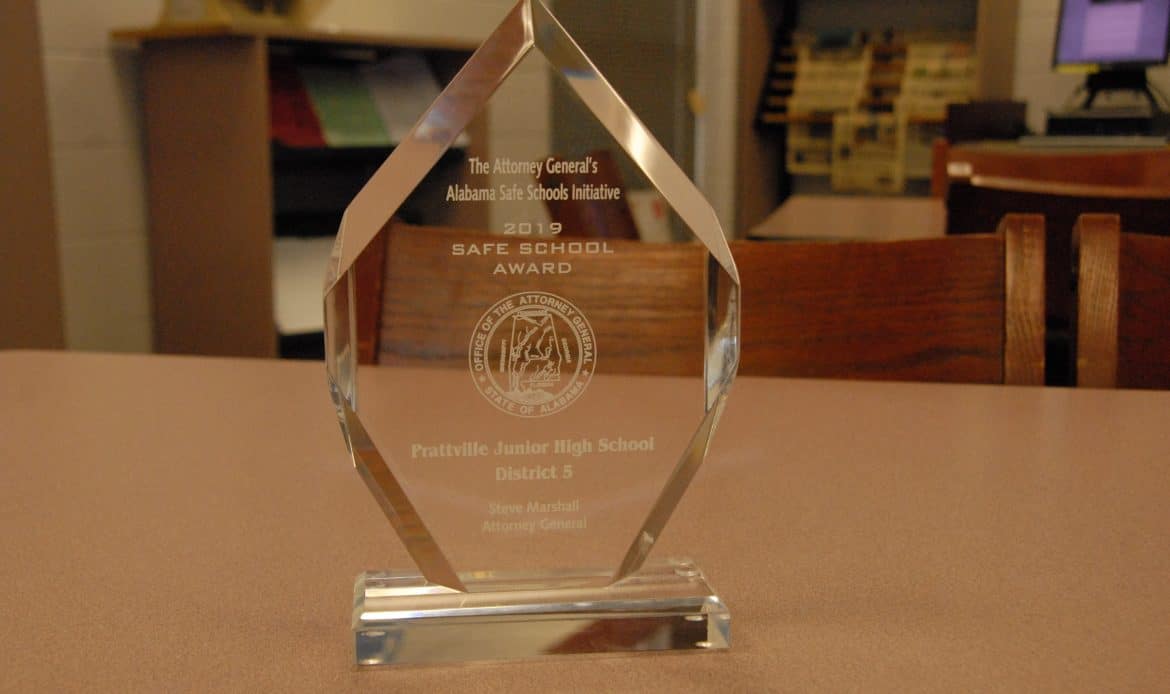 In presenting the award today Attorney General Marshall said, “The Attorney General’s Office is proud that Prattville Junior High School was selected as one of the winning schools in Alabama for 2019, receiving this distinction for the second year in a row. In making this decision, judges noted many things that distinguished Prattville Junior High: multiple agencies included in preparation and crisis management, K9 use, visitor entry cameras, a tip line, and mass communication system.”