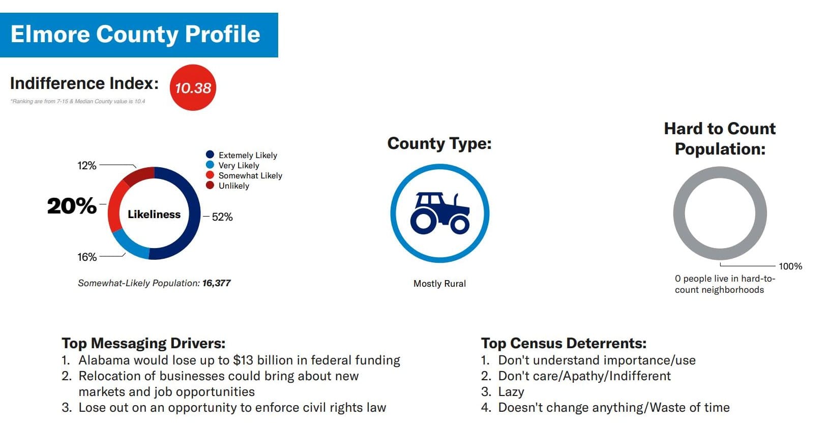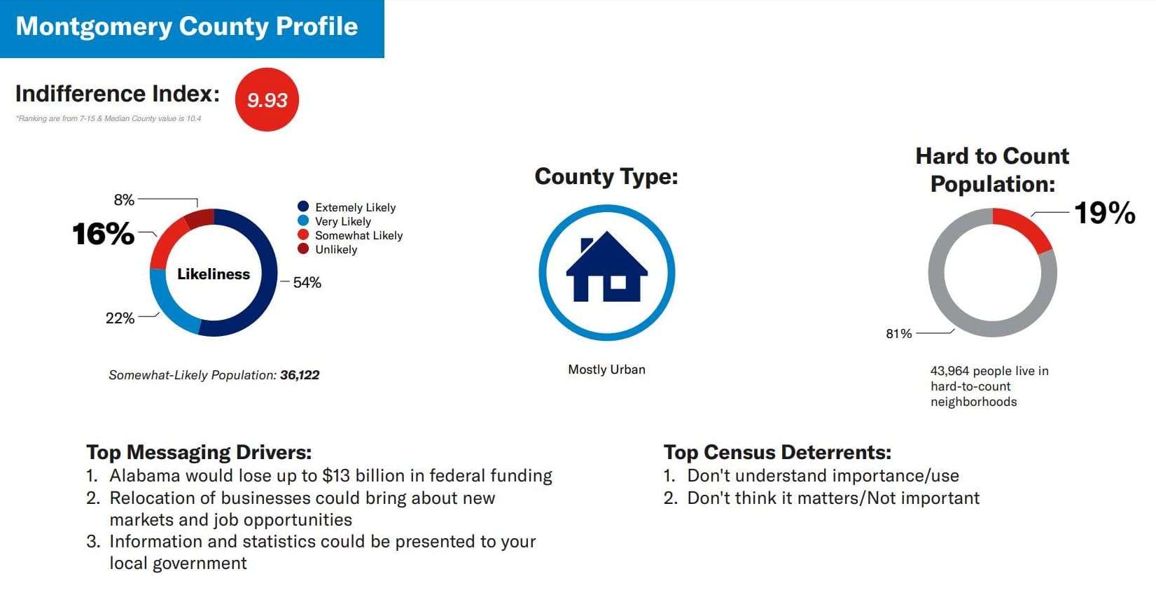 “It’s important for us to understand each county’s odds of participating in the Census as well as accompanying motivations in order to understand how we can increase participation in apathetic areas,” said Kenneth Boswell, Alabama Counts! Chair and director of the Alabama Department of Economic and Community Affairs (ADECA). “We can be more intentional in our outreach and education efforts in areas where we see the biggest need.”