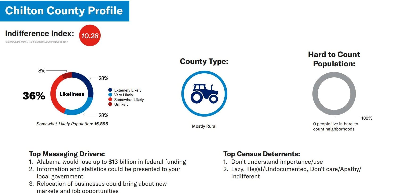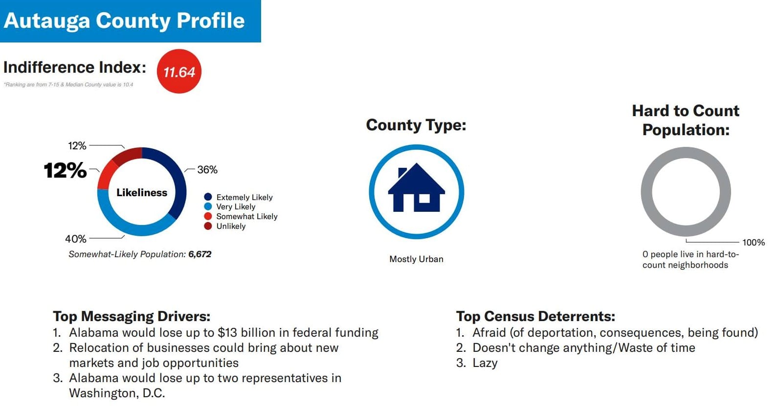 Research released Monday by The Alabama Counts! 2020 Census Committee reveals early indications of both county likelihood in filling out Census forms, as well as top motivating factors influencing participation.