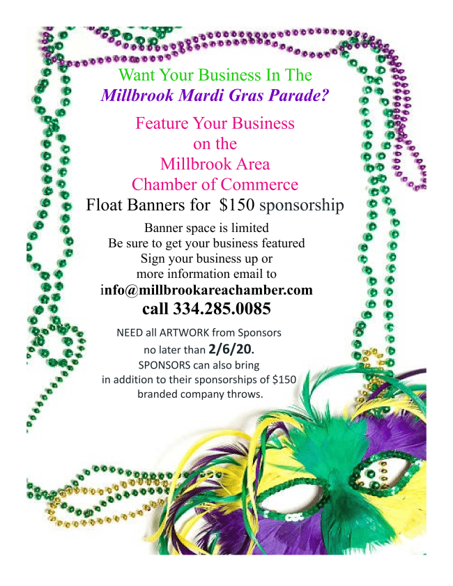 Would you like your business featured in the Millbrook Mardi Gras Parade? Feature your business on the Millbrook Area Chamber of Commerce Float, for a float banner sponsorship of $150.