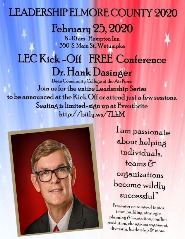 The Leadership Elmore County 2020 Kick-Off will host a FREE conference Feb. 25 with Dr. Hank Dasinger. He is the Dean of the Community College of the Air Force. It will be held at the Hampton Inn, located at 350 S. Main Street in Wetumpka from 8-10 a.m.