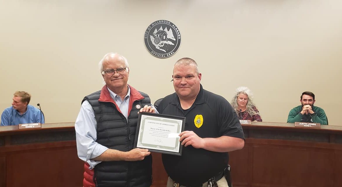 Another award for the evening went to Millbrook Mayor Al Kelley, presented by Police Chief P.K. Johnson, for his and his wife Brenda’s consistent help each year with Operation Blue Santa.
