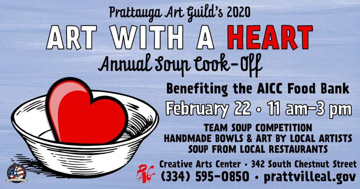 The Prattauga Art Guild will hold their annual fundraiser for the Autauga Interfaith Care Center food bank on February 22 at the Prattville Creative Arts Center and Gallery (342 South Chestnut Street). There will be a Soup Cook-Off with teams and individuals competing for the Golden Bowl and Silver Ladle Awards.