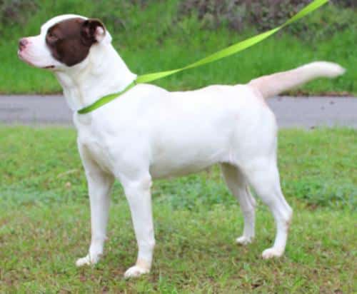 Raylee is a 2-year-old female American Bulldog mix who must be spayed before she is adopted. She came to PAHS as a stray and her owner never came looking for her. Raylee is a solidly built lady who weighs 50 pounds so she is considered to be a medium sized adult dog. She is a stunningly pretty girl who is almost completely white with chocolate markings on her head. Raylee is a friendly and sweet girl who would be fine in a home with children. We suggest if you have other dogs that you bring them in for a meet and greet with Raylee. She gets along well with most other dogs but might play too rough to be with smaller dogs. Raylee loves to be outside and would appreciate a nice fenced yard where she could safely play. She is leash trained and enjoys going out for a walk. Raylee is pretty frisky so she would need to have regular exercise. Come meet this great big beautiful girl! Raylee is a wonderful dog who will be a great addition to some lucky adopter’s family.