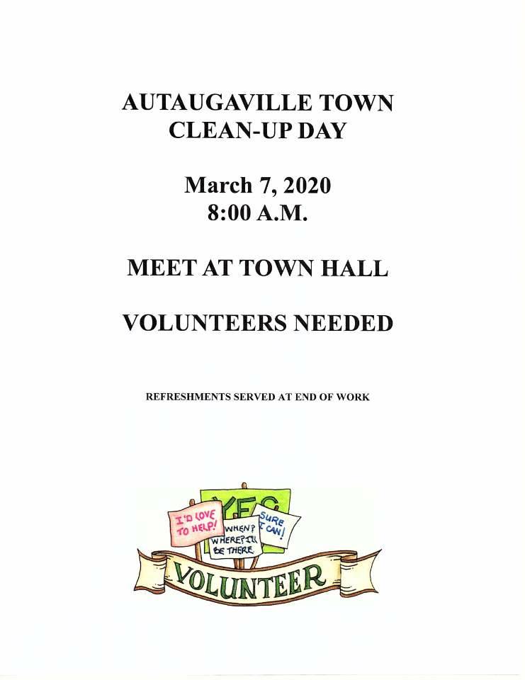 My fellow citizens of Autaugaville: Spring is near and it’s time we all come together and spruce up our Beautiful Town. Join me and the Town Council Saturday, March 7, 2020, 8:00 am at Town Hall and participate in our Annual Town Clean-Up Day. I will be looking to see you there.