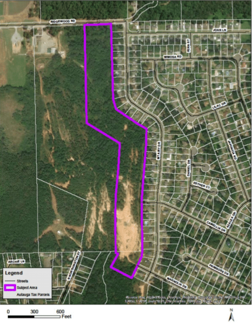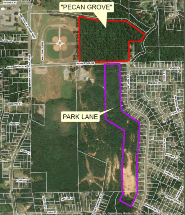 The compromise is that the city would rezone their “Park Lane” property [see image] located near Camellia Estates from R-2/R-3/R-5 to just R-3 (single-family residential). In return, Marshall would give the City of Prattville the “Pecan Grove” property [see image] located near Mac Gray Park.