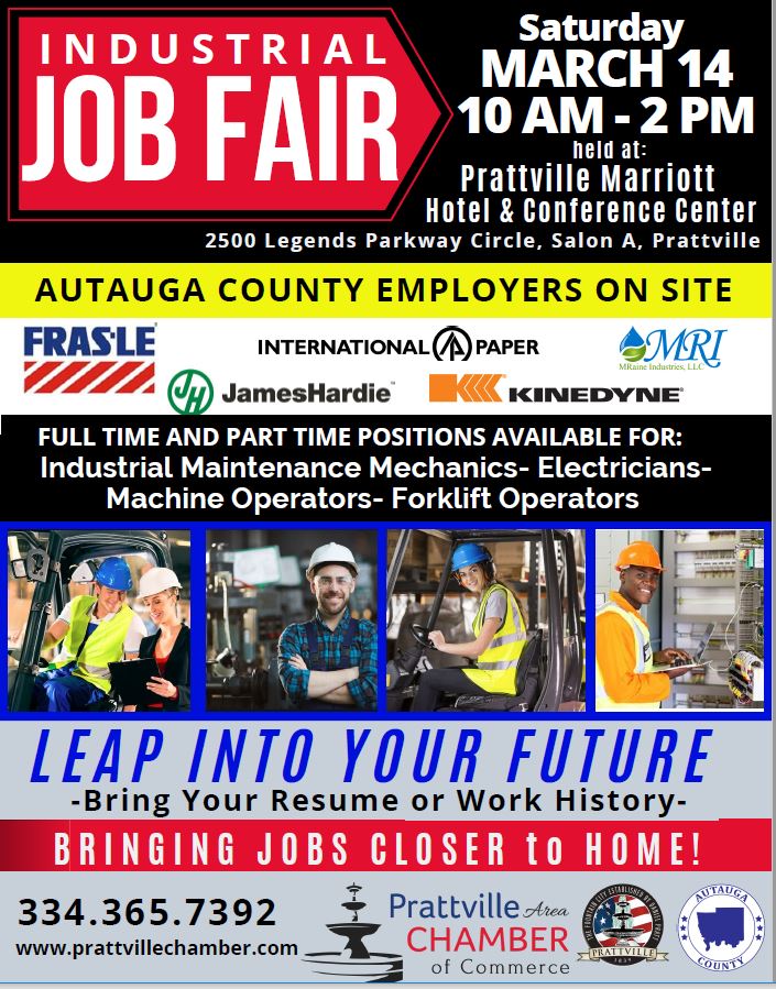 The Prattville Area Chamber of Commerce is proud to partner with Autauga County industries, the City of Prattville, Alabama Government and Autauga County to host the inaugural Industrial Job Fair for Autauga County Industries for Industrial Maintenance Mechanics, Electricians, Machine Operators and Forklift Operators, on Saturday, March 14th from 10 AM- 2 PM at the Prattville Marriott Hotel & Conference Center, 2500 Legends Parkway Circle, Salon A, Prattville, AL.