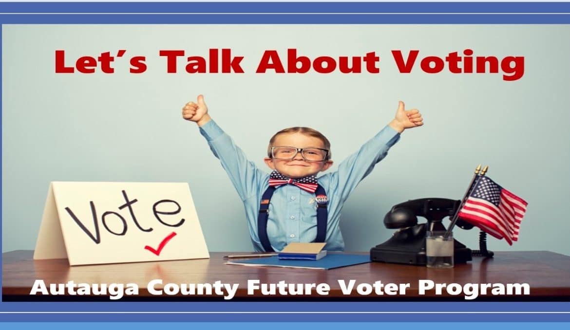 The Autauga County Probate Office conducts a future voter program in the Autauga County school system. This program encourages youth (K4 to 5th grade) to learn about the voting process.