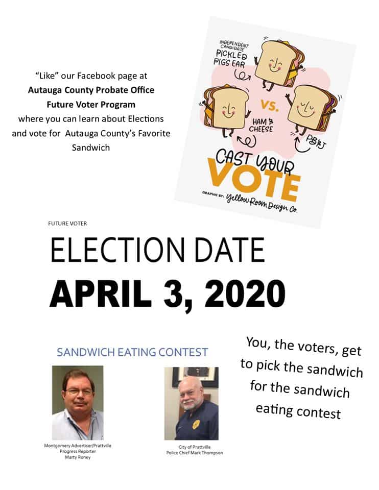 Make sure to visit the Facebook page and check out some of the hilarious videos. We all need a laugh right now!! https://www.facebook.com/Autauga-County-Probate-Office-Future-Voter-Program-111578653804874/