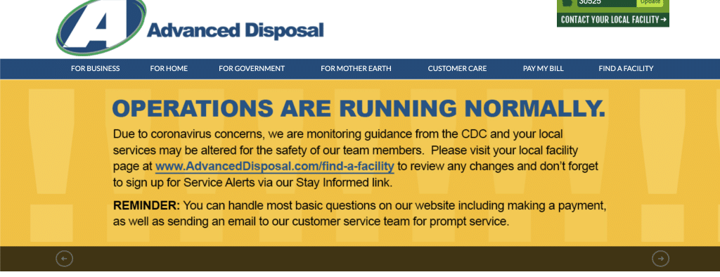 Advanced Disposal is closely monitoring guidance from the CDC. Please stay informed of any changes in your service by visiting www.AdvancedDisposal.com/find-a-facility or sign up for Service Alerts via the Stay Informed link. Should you have any questions about your Advanced Disposal service, please visit their website here or call 334-252-0458.