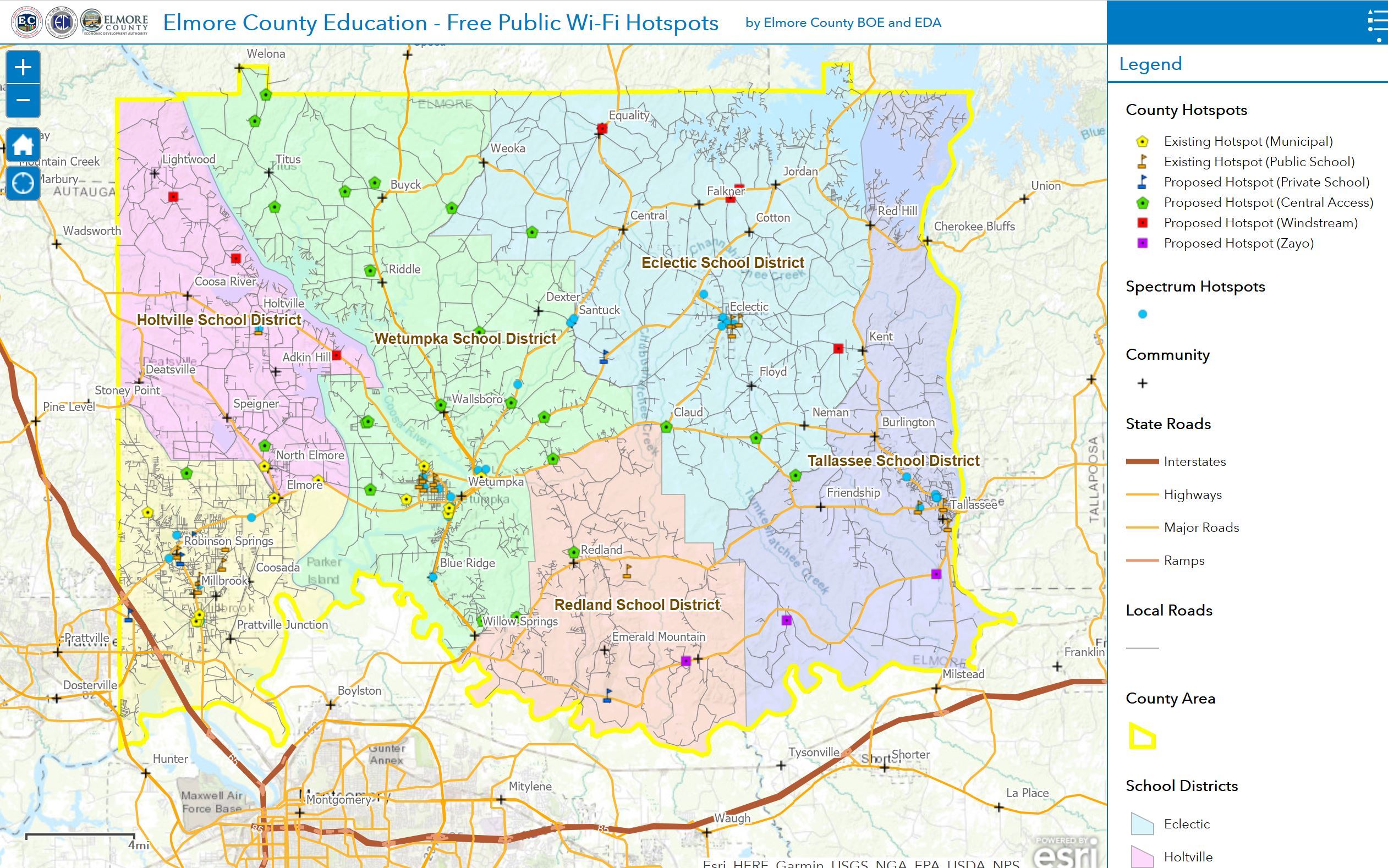 The Elmore County Commission in partnership with the Elmore County Board of Education (ECBOE), Elmore County Economic Authority (ECEDA), our municipalities, and Central Access announces the release of an interactive map of public broadband hotspots available in the county. With the assistance of Central Access, additional public hotspot locations that are soon to be available are also included on the map.