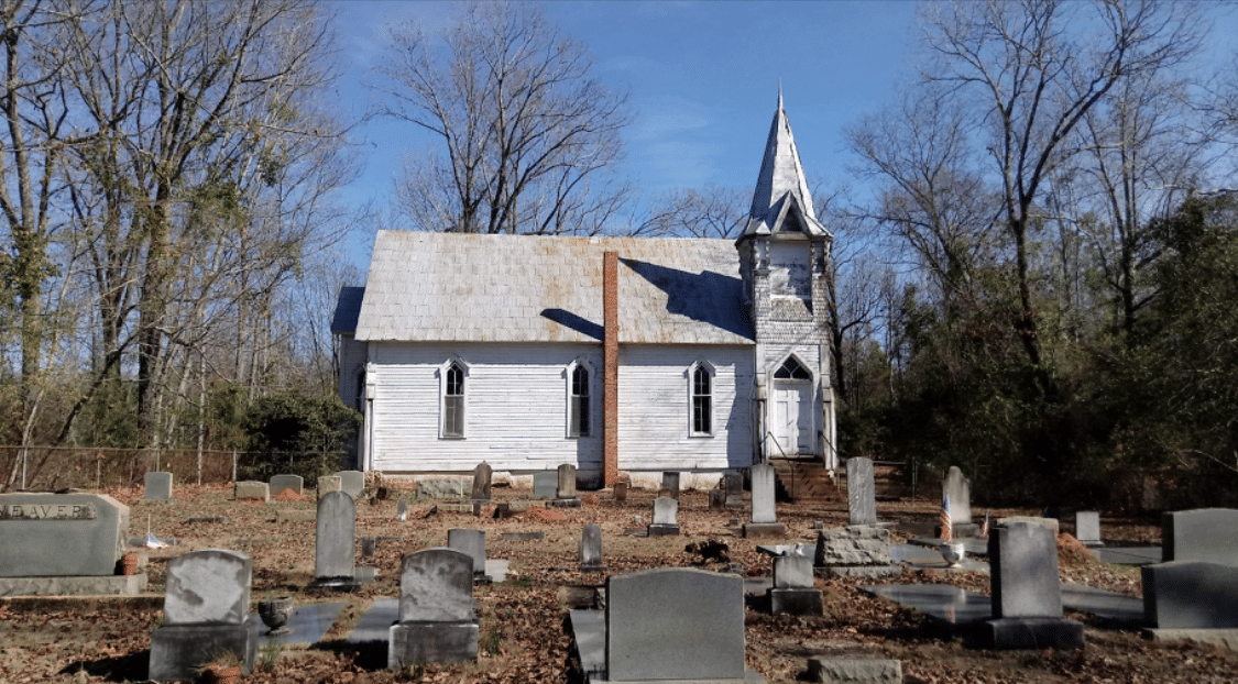 Vine Hill Presbyterian Church was established in 1879 by members of the Presbyterian Church in Selma, who made Vine Hill their summer home. The first church building was destroyed by fire in the 1880s. The present structure, which was made of native heart pine throughout, was constructed in 1887. The church has arched walls that roll up into the ceiling above. The interior is stained throughout. The church thrived through the 1900s, but membership began to pass away, or move off to other areas. The church discontinued services about 1990. The church has set empty for several years. Efforts to save the historic structure began in 2019. OAHS has a three-year plan for restoring the church, which includes repairing and reglazing all the windows, repainting the exterior, replacing the interior tongue & groove flooring, restoring the original belfry, and other improvements to the old cemetery and grounds.