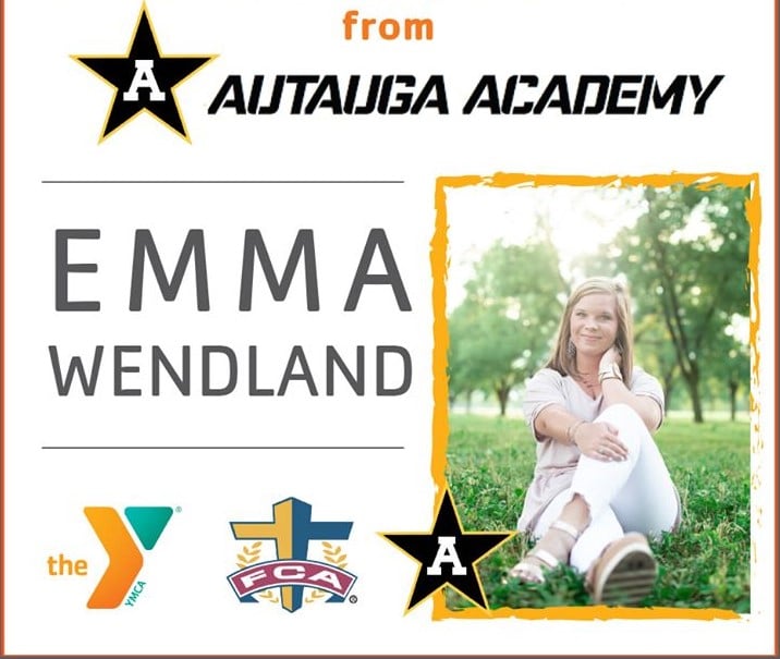 Emma Wendland is the kicker for Autauga Academy’s football team and played soccer for several years.  She had a 4.05 GPA and is a leader in her school, church, team, and family. She is actively involved in Church Street United Methodist Church.