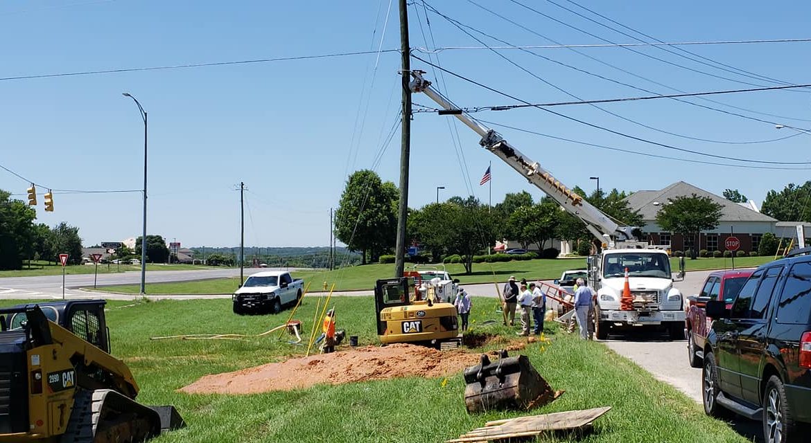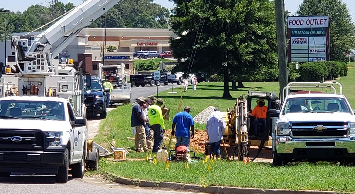 UPDATE: From Millbrook Utilities Director Michael Harris: As of 2:30 p.m. crews have dug to a depth of 16 feet and found the break in the main line in front of Food Outlet. This is good news! Now they can begin repairs to the break, and hopefully get water flowing again.