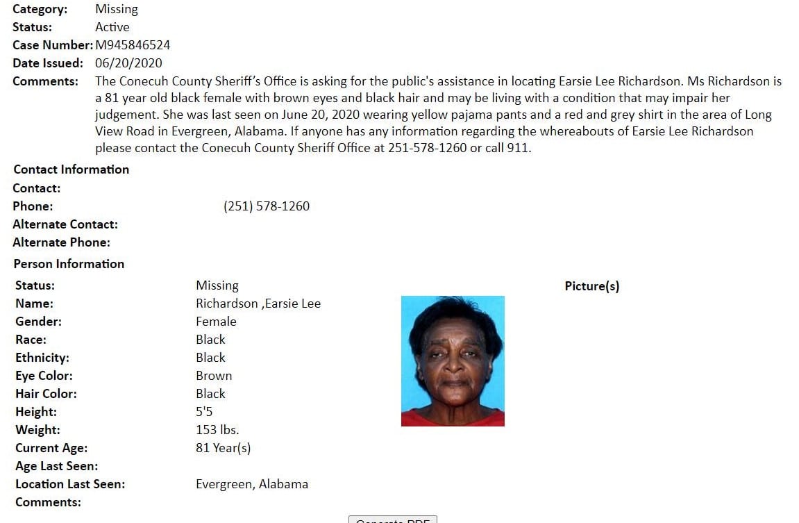 The Conecuh County Sheriff’s Office is asking for the public’s assistance in locating Earsie Lee Richardson. Ms Richardson is an 81-year-old black female with brown eyes and black hair and may be living with a condition that may impair her judgement. She was last seen on June 20, 2020 wearing yellow pajama pants and a red and grey shirt in the area of Long View Road in Evergreen, Alabama. If anyone has any information regarding the whereabouts of Earsie Lee Richardson please contact the Conecuh County Sheriff Office at 251-578-1260 or call 911.