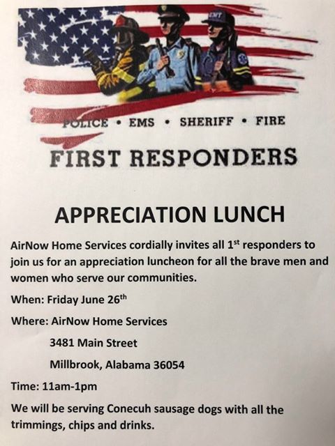 Area First Responders are invited to AirNow Home Services in Millbrook Friday for a special luncheon to show appreciation for them, and all they do for our communities.