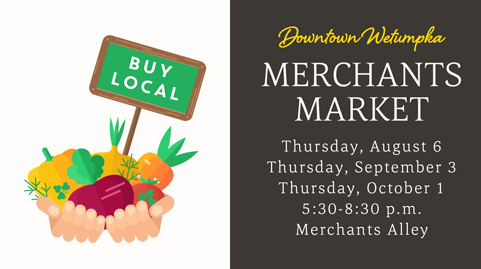 You’ve asked, we answered! Thanks to our fabulous promotion committee, we’ll be hosting the Downtown Wetumpka Merchants Market the first Thursday of August, September and October to help support local farmers and merchants, all outside with plenty of room to move freely!