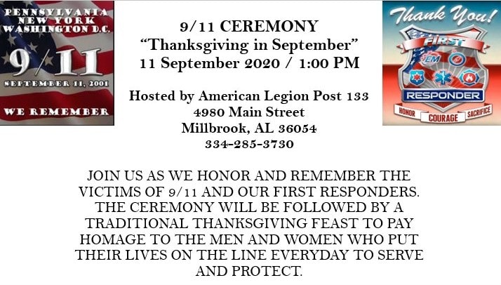 From Commander Leslie Jeffries Looney: “Join us as we honor and remember the victims of 9/11 and our First Responders. The ceremony will be followed by a traditional Thanksgiving feast to pay homage to the men and women who put their lives on the line everyday to serve and protect.”