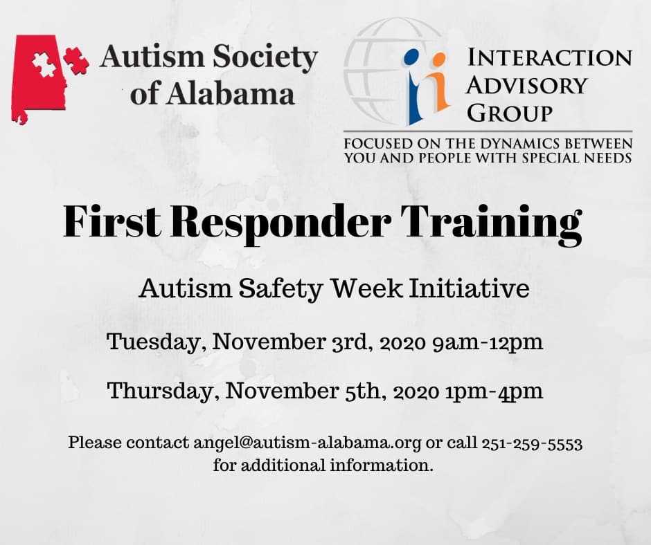 The Autism Society of Alabama and Interaction Advisory Group, LLC are offering Virtual First Responder Training for Law Enforcement, Fire-Fighters, individuals working in the Criminal Justice System and Department of Human Resources.