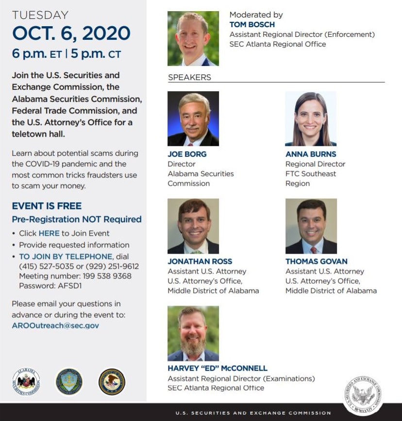 The Alabama Securities Commission, the Securities Exchange Commission (SEC) and other federal agencies are providing a free seminar to teach constituents how to protect themselves from financial fraud; especially fraud targeting the faithful in Alabama. Did you know the cost of fraud in the U.S. is in the BILLIONS? The Alabama Securities Commission is the state agency charged with protecting investors from financial fraud and we cordially invite you and Alabamians to participate in this event.