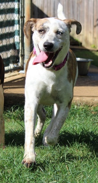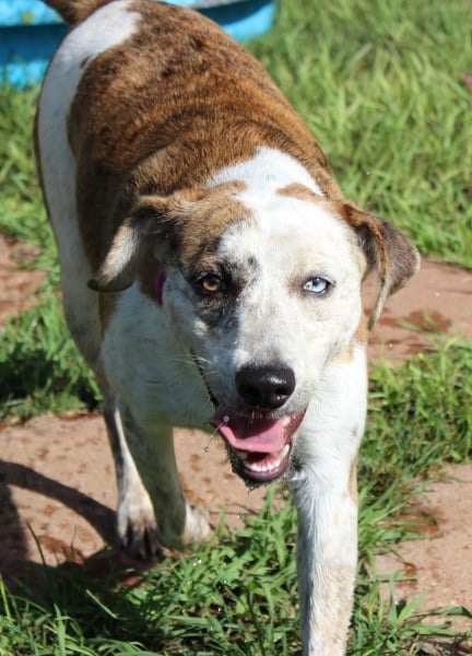 Macy is a one-year old female Catahoula mix, 55 lbs, striking with her one blue eye and one brown eye. She is an active, playful girl who loves the water and will do best in an active family where she can rough and tumble with some older children to call her own. Macy is good with other dogs.