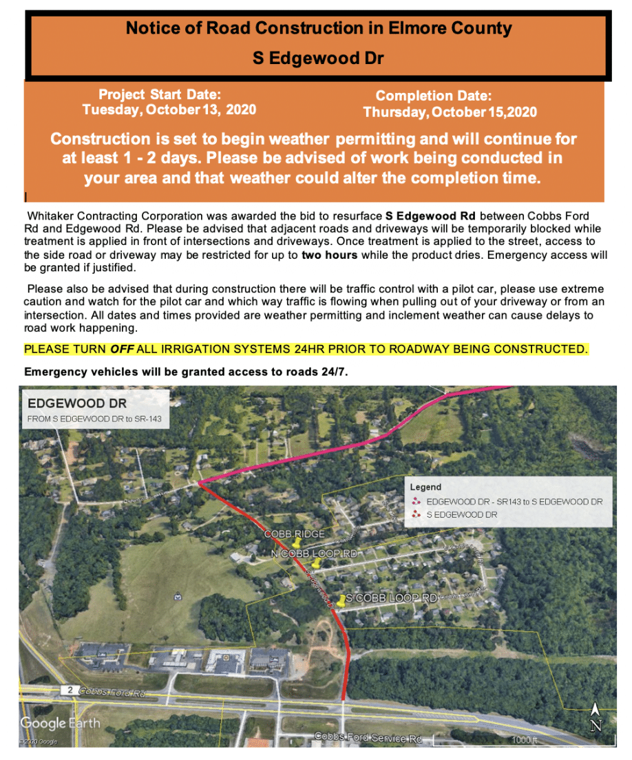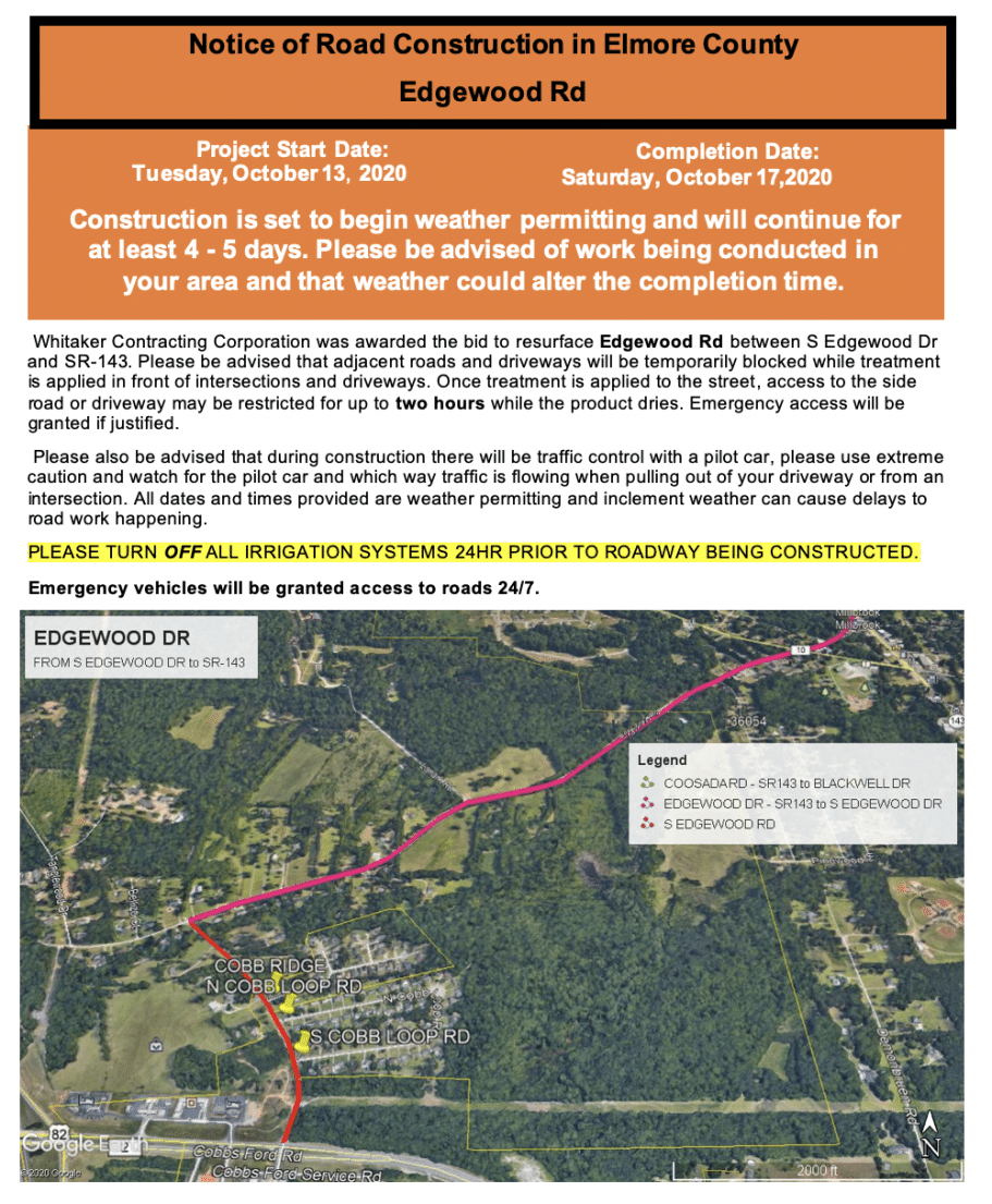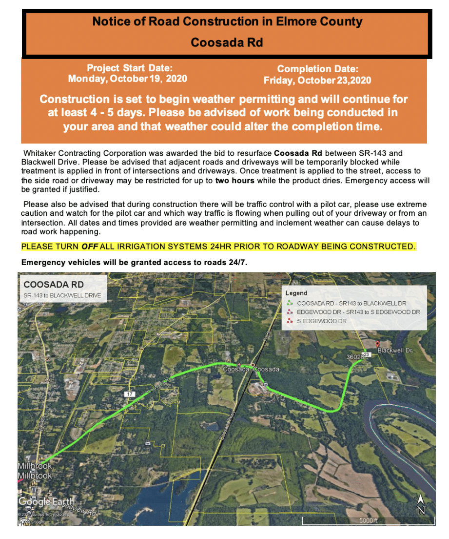 The start and finish dates listed on the notices are estimates. Whitaker has targeted this week to begin work, but plans are subject to change depending on weather conditions. Should you have any questions related to these projects, please feel free to contact the Elmore County Highway Department at (334) 567-1162.
