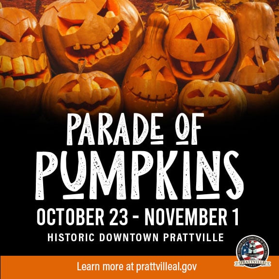 The City of Prattville will feature carved and decorated pumpkins from our community along with festive storefronts and seasonal displays that will light up and transform Historic Downtown Prattville. This family-friendly event is free and open for everyone to participate. Grab a pumpkin, get in the spirit, and share your creativity at the Parade of Pumpkins!