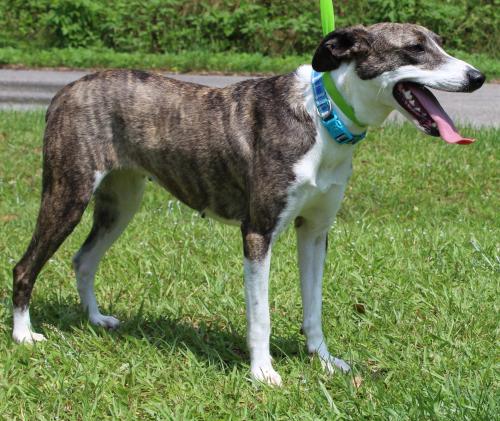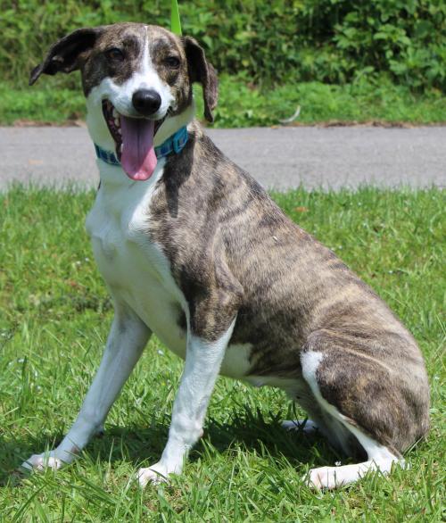 Maggie is a 2-and-1/2-year old female Greyhound mix who has been spayed. She came to PAHS as an owner turn because she will not stay in the fenced yard. Maggie is a pretty girl whose short coat is brindle with white markings. She currently weighs 36 pounds so she is considered to be a medium sized dog. This is a sweetheart of a dog! She is super affectionate and really just wanted to be loved on and cuddled when we made her pictures. Maggie is very playful and lively so she would enjoy life best with an active family who would be sure to include her on all their outdoor adventures! She is already leash trained, house trained, and would love going on nice walks with her new owner. We believe Maggie would be great in a home with other dogs and children. We would not recommend she be in a home with cats. Maggie appears to be an intelligent gal; and with her quiet, and gentle character she is sure to make an excellent family dog! Come check this little darling out soon!