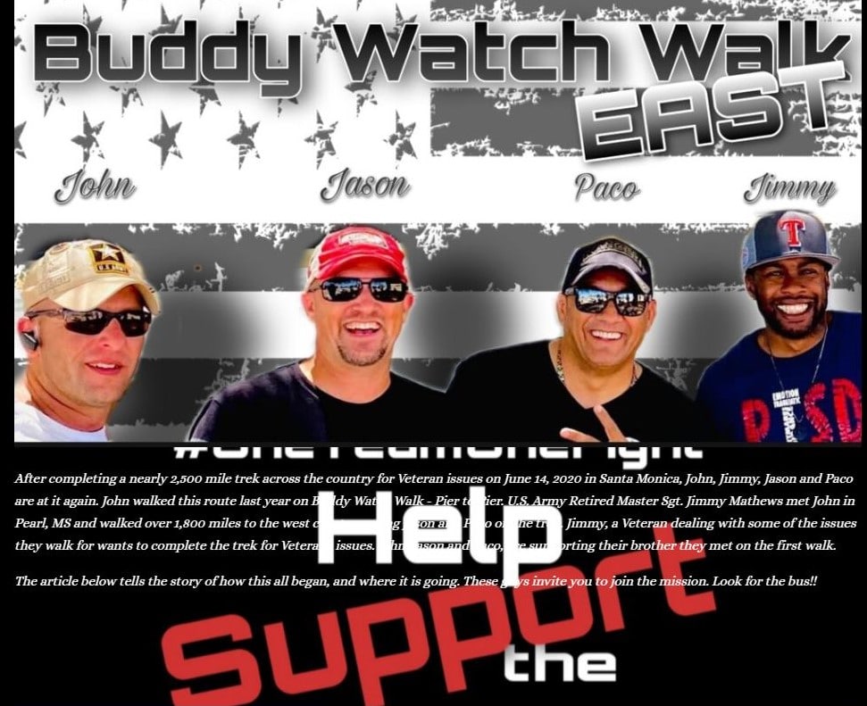 The Buddy Watch Walk raises awareness on Veteran Issues. There is a Crisis Line for Veterans, which is 1-800-273-8255 (Press 1)