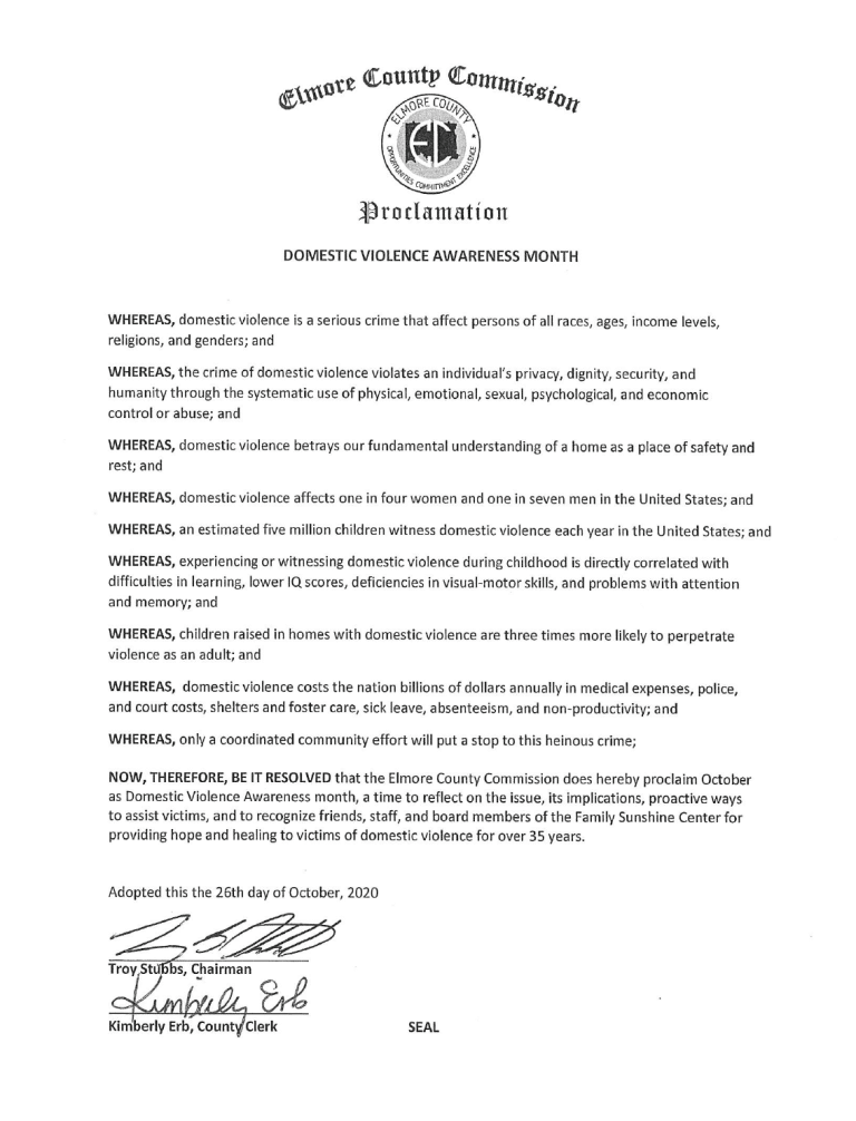 At their Work Session meeting Monday, the Elmore County Commission presented a resolution recognizing October as Domestic Violence Awareness Month and praised the work of the Family Sunshine Center.