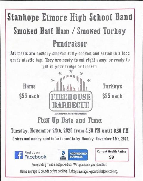 The Band will be selling smoked hams and turkeys available for pickup on Tuesday, Nov. 24 from 4:30 to 6:30 p.m. Please place your order now!