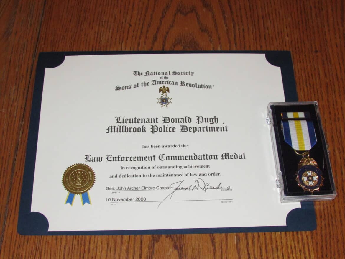 Lieutenant Don Pugh, with the Millbrook Police Department, was recognized Tuesday night by the Sons of the American Revolution, General John Archer Elmore Chapter of the Alabama Society. The presentation of a Law Enforcement Commendation Medal took placed during a meeting of the John Archer Elmore Chapter held at the Fantail Restaurant of Millbrook.