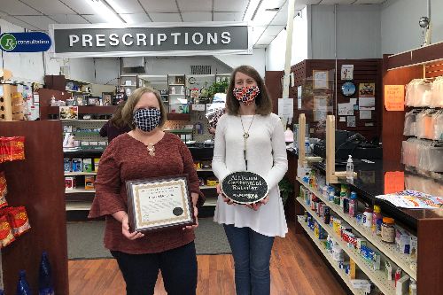 Friday, Nov. 13, the Alabama Retail Association presented Cowart Drug Co. Inc. with an Alabama Centennial Retailer award at its Calera Main Street location. The business, which has been an Alabama Retail Association member since 1993, received a bronze plaque to place outside its store and a certificate suitable for display inside. Pictured below are Alabama Retail’s Nancy Dennis and Cowart Drug Co. owner Kacie White.