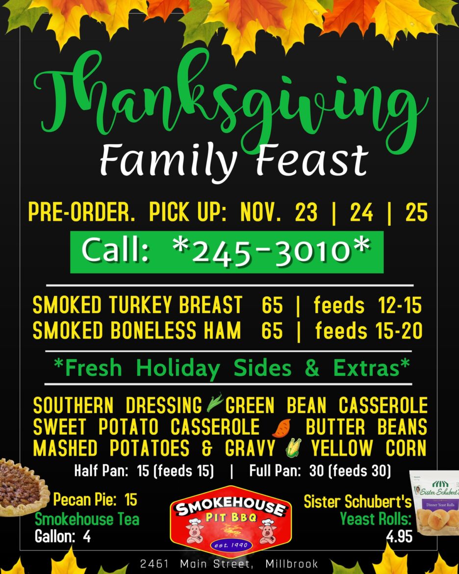 Whyย endure extra long lines this year shopping for Thanksgiving?ย ๐ฆย Letย Smokehouseย of Millbrook cook ourย Family Feastย for your gathering! Hickory-smoked Turkey Breasts + Smoked Hams:ย smoked for 6 hours. Thanksgiving Sides & Pecan Pie made-from-scratch. Pre-orders now!ย Call: *245 – 3010*