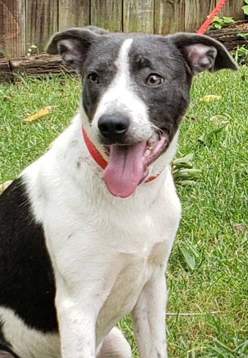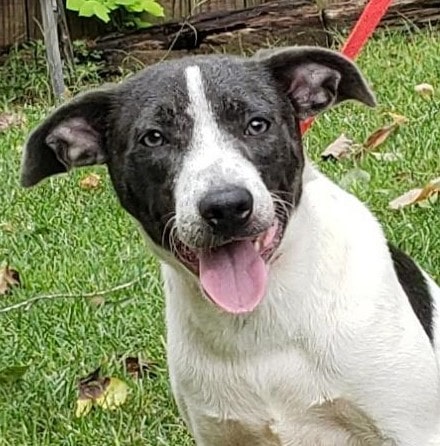 Kim is a very pretty blue and white girl Terrier mix female, one-year old and only about 30-35 lbs. She is a happy and very loving girl who loves to play; good with other dogs, might get into some mischief along the way but will be a lot of fun!