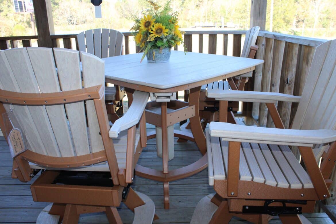 Stroup started with about five pieces of outdoor furniture made of recycled milk jugs and some solid wood pieces meant for indoor use. “The recycled milk jug furniture is warranted for life,” she said.